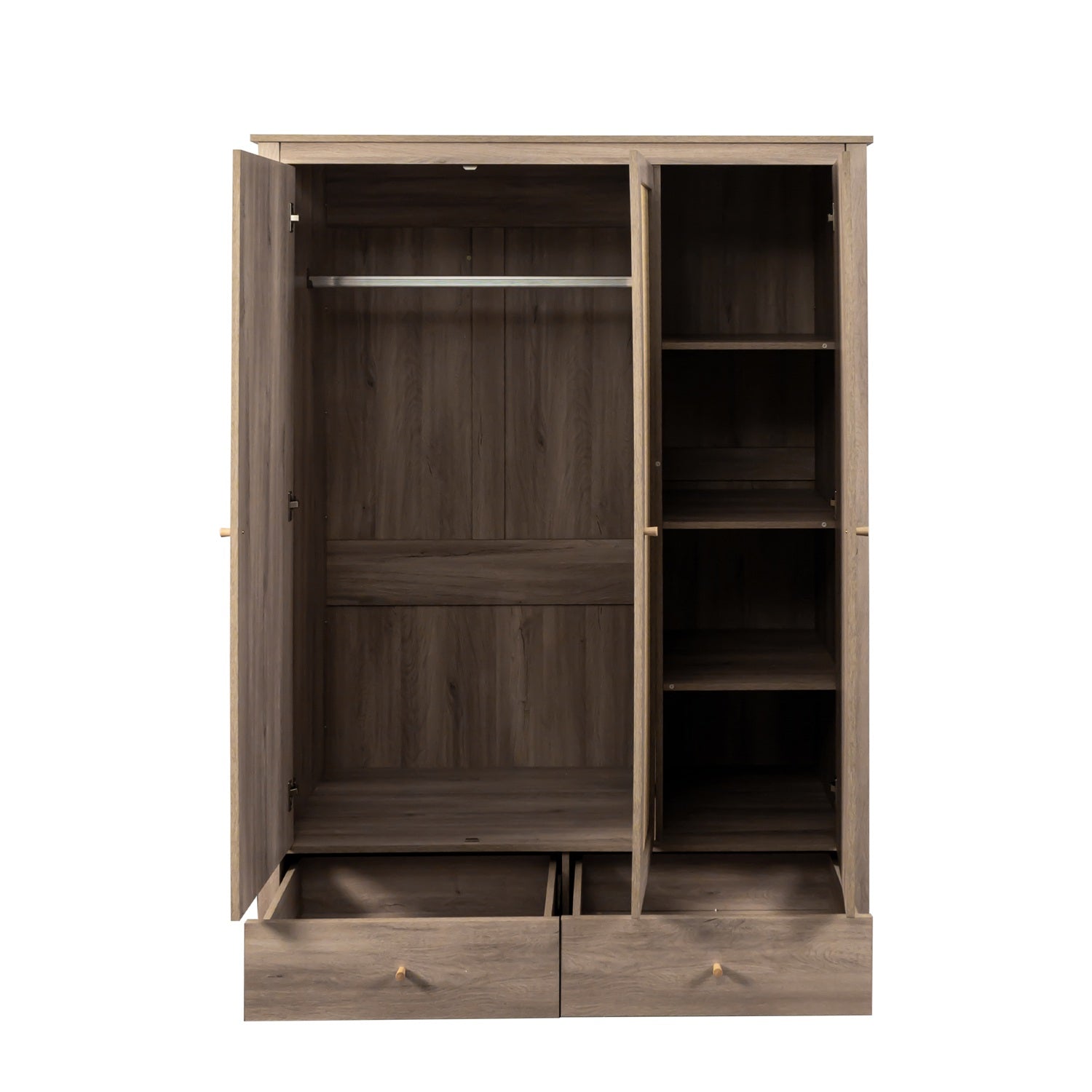 Elevate your space with the understated sophistication of our 3-Door, 2-Drawer Wardrobe, where natural beauty meets impeccable design. Wrapped in a rich oak effect finish and featuring hand-woven rattan panels, this piece brings warmth, texture, and refined elegance to any interior.